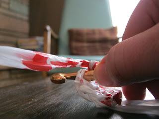 You will want to start by making a simple loop. Like a cancer or AIDS awareness ribbon. Except this one is made out of a plastic bag. I hold this with my left hand.